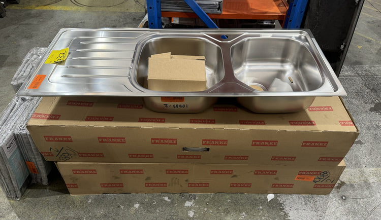 Franke stainless steel double bowl sink with left hand drainer includes plug, waste & hardware.