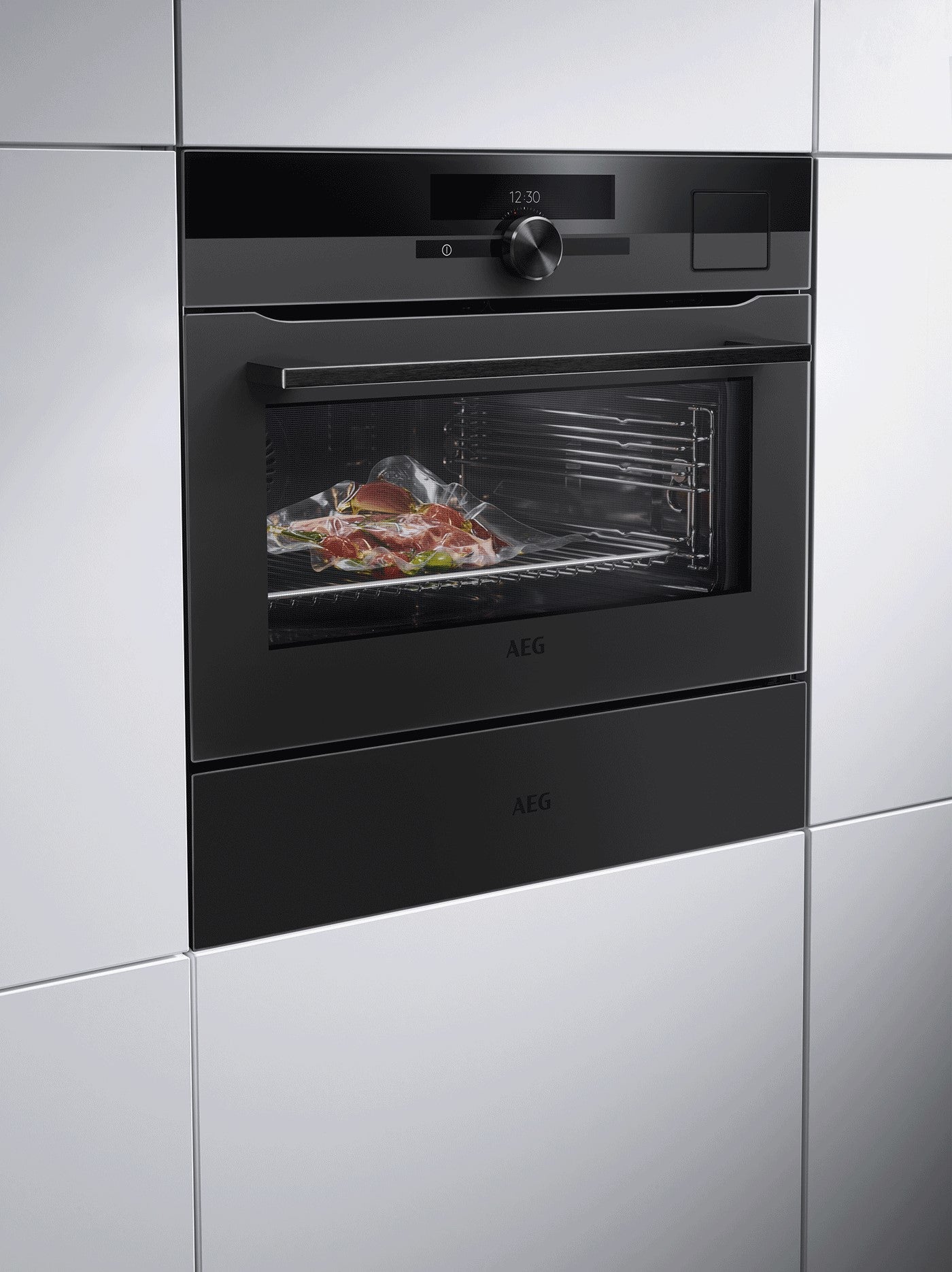 AEG 450mm multifunction 25 matte black SteamPro compact oven with automatic Steamify® function, Command Wheel control, full steam function, steam cleaning functions, humidity sensor, SousVide, SteamPro, Food Sensor, Assisted Cooking, OptiFlex™ telescopic runners, SoftMotion™ hinges and FloodLight™ system
