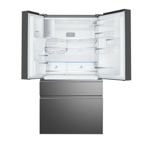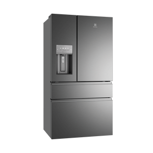 Electrolux 609L dark stainless UltimateTaste 900 french door fridge, with FlexFresh fully convertible entertainer's drawer, TasteLockAuto Easy-glide crispers with automatic humidity control, Slide-back and Flip-up shelves and in door ice & water dispenser, SmartSplit Door Design, Connectivity, Mark resistant real stainless steel, Filtered ice and water, Slide-back and Flip-up shelving, SnackZone, UltraChill, Drinks Storage, Snacks Storage, FlexStor, FreshPlus Cooling, Quick freeze function, Boost mode, TwinTech Cooling System, Electronic controls with LED display and acoustic signal, Holiday mode, R600a refrigerant, LED lighting, Frost free, Fresh Sense deodoriser.