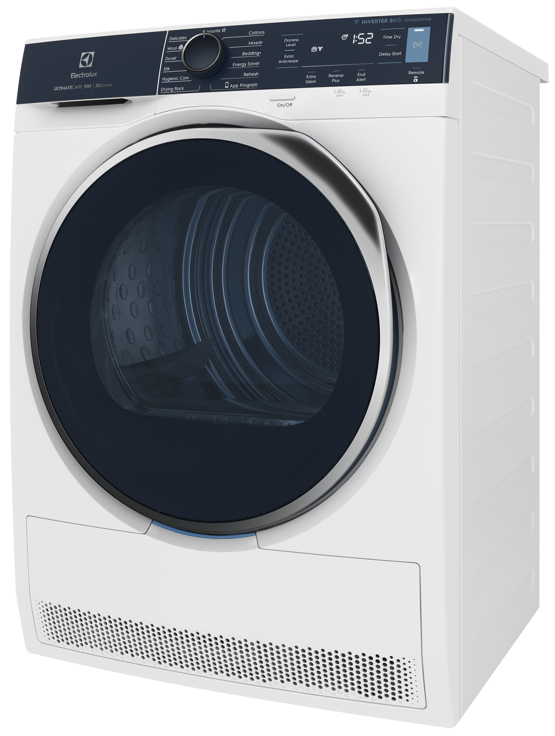 Electrolux 8kg UltimateCare 900 heat pump dryer. With an 8kg capacity, 3D Sense technology and a huge range of features, you will enjoy exceptional results every time. The innovative heat pump system ensures gentle drying, high performance and energy efficiency with a 8-star energy rating. Plus, the Advanced SensiCare function gently dries your clothes without over drying, Woollens and silks programs, Special programs for easy iron, reversing tumble action, Time drying, Drum Light.