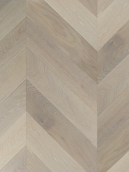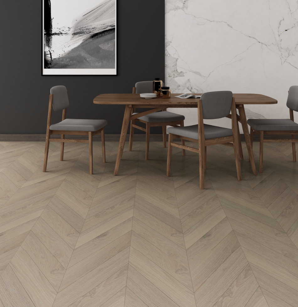 Natural Limed Engineered Oak Chevron Flooring (Model #RA-CV-1002-LY) offers a sophisticated and timeless design, ideal for enhancing various interior spaces. Each plank measures 770mm in length, 125mm in width, and 15mm in thickness, featuring a 3mm oak veneer. The chevron pattern adds a dynamic visual appeal, while the natural limed finish provides a light, airy ambiance. Engineered for stability and durability, this flooring is suitable for both residential and commercial applications. Each carton covers 1.536 square meters, facilitating efficient installation. The tongue-and-groove system ensures a secure fit, and the multi-layer construction offers resistance to moisture and temperature fluctuations. This flooring is compatible with underfloor heating systems, providing added comfort. The brushed surface enhances the wood's natural texture, and the UV lacquer finish offers protection against daily wear and tear. With its blend of aesthetic appeal and practical features, this flooring is a versatile choice for various interior designs.