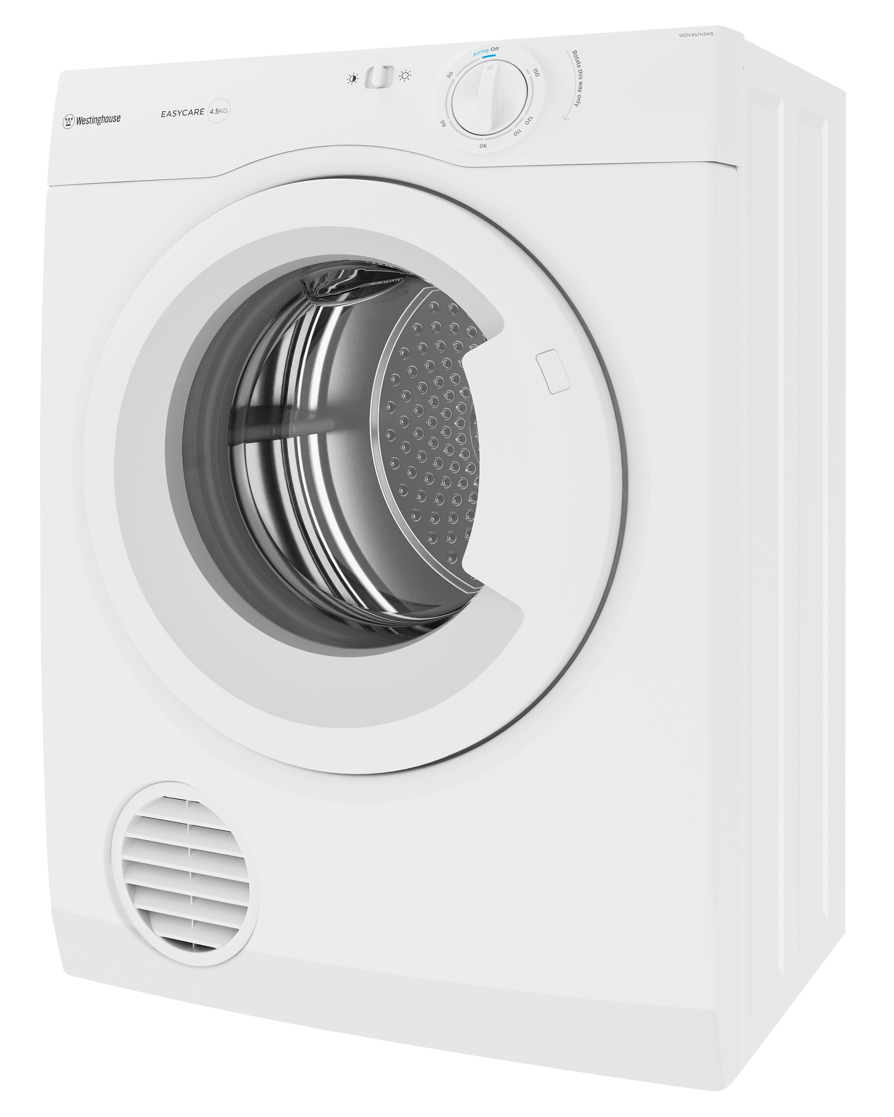 Westinghouse 4.5kg vented tumble dryer comes with anti-tangle reverse tumbling action for even drying results. Other features include time drying and warm / hot setting, Front lint filter, easy to use rotary dial control, Time drying, Front or rear venting, and Child safety lock door.