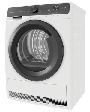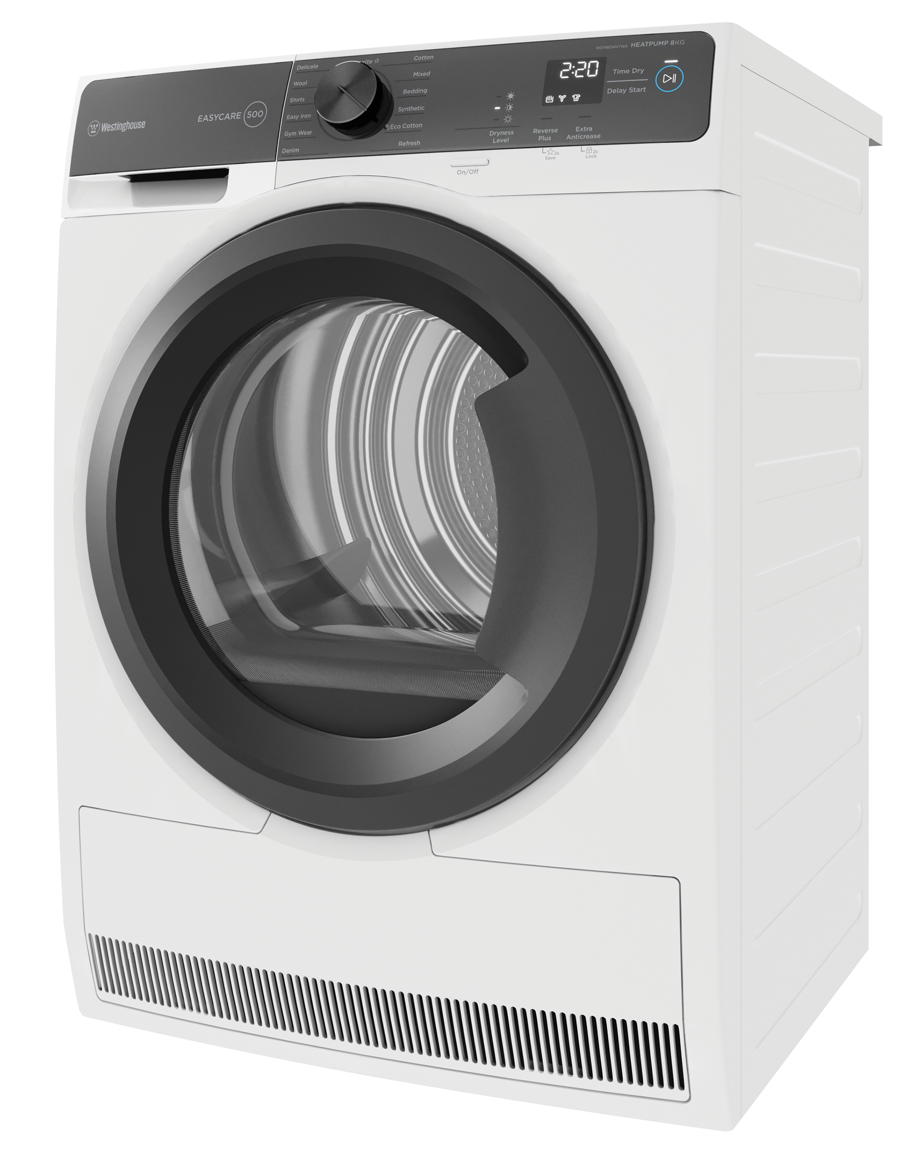 Westinghouse 8kg EasyCare 500 series heat pump dryer. The innovative heat pump system with SenseDry technology ensures gentle drying, great performance, energy efficiency, Easy to use rotary dial control, Reverse tumbling action, Delicates setting and Auto cool down.