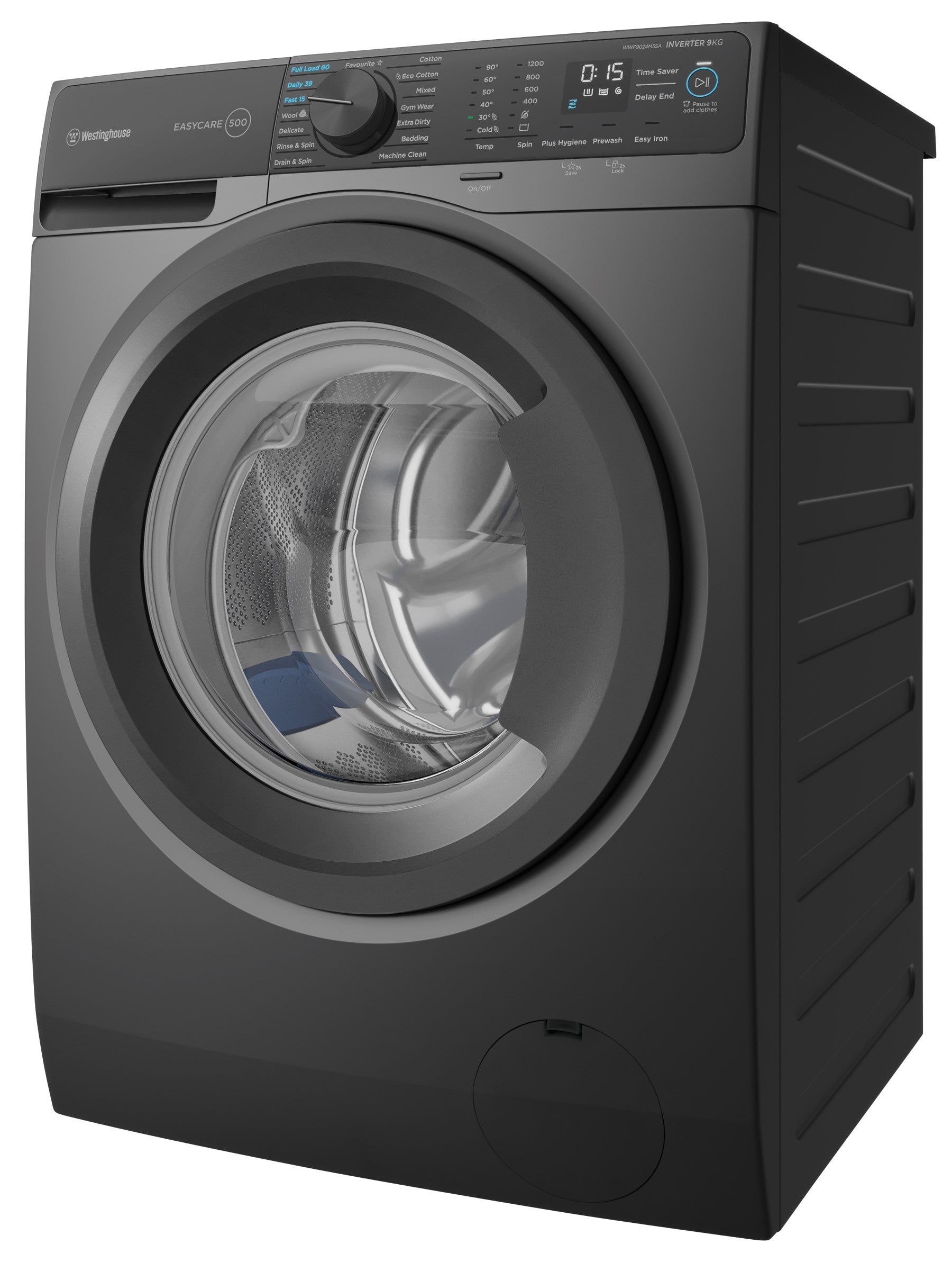 Westinghouse EasyCare 9kg front load washing machine with 1200rpm spin speed, durable inverter motor, 3 fast wash programs, 3XL drum opening, time remaining display, Full load 60, Fast 15, Daily 39, Liquid or powder detergent drawer, Auto water level sensing, Pause and add button, Delay end option to plan when your wash finishes, High spin, less dry timeanf Inverter motor.